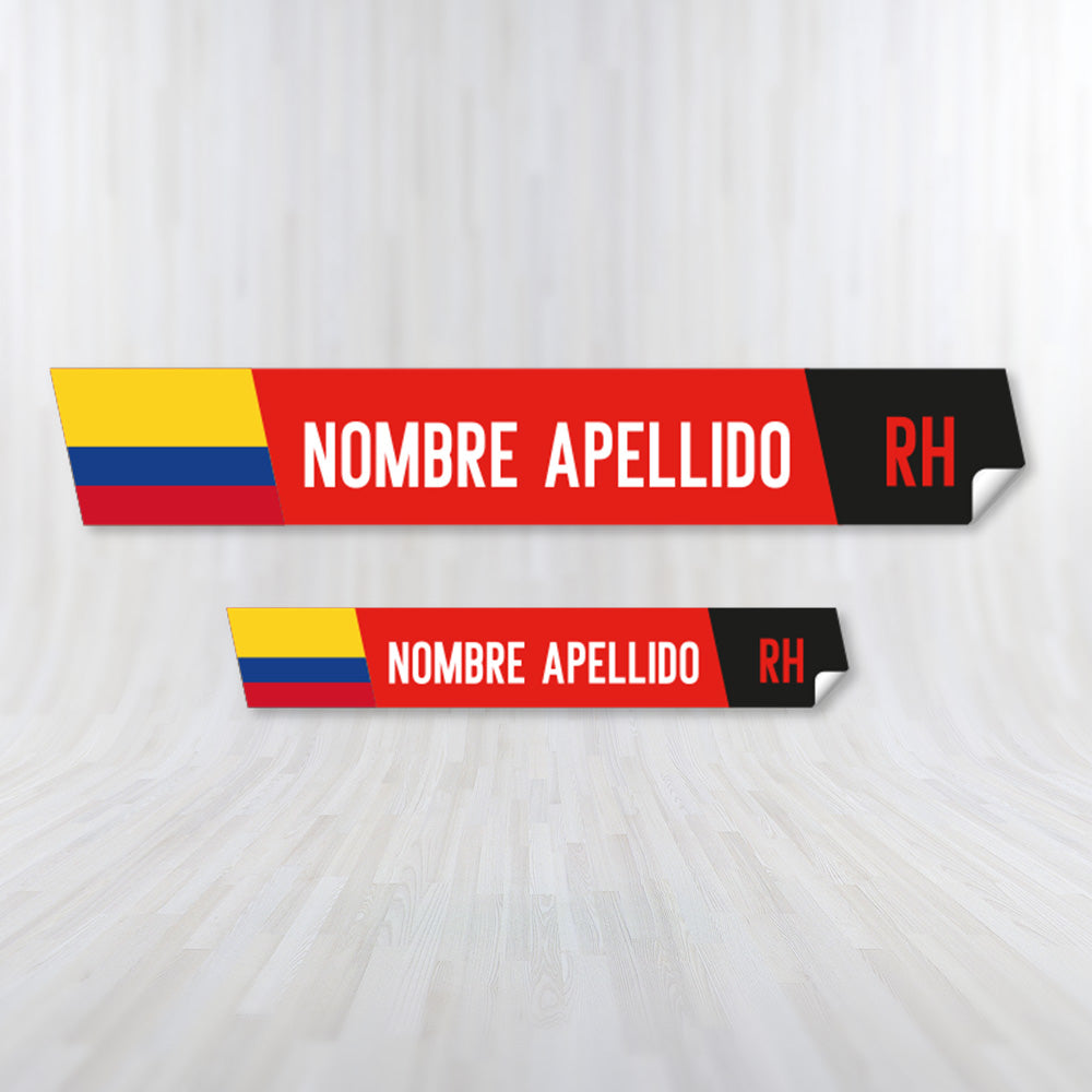 Set of 4 large Stickers + 4 small Stickers in LAMINATED Vinyl personalized with your NAME, LAST NAME, RH and FLAG.