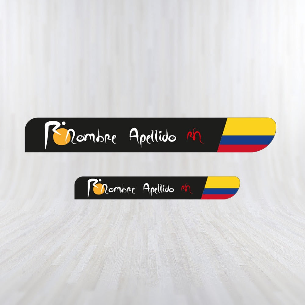Set of 4 large Stickers + 4 small Stickers in LAMINATED Vinyl personalized with your NAME, LAST NAME, RH and FLAG.