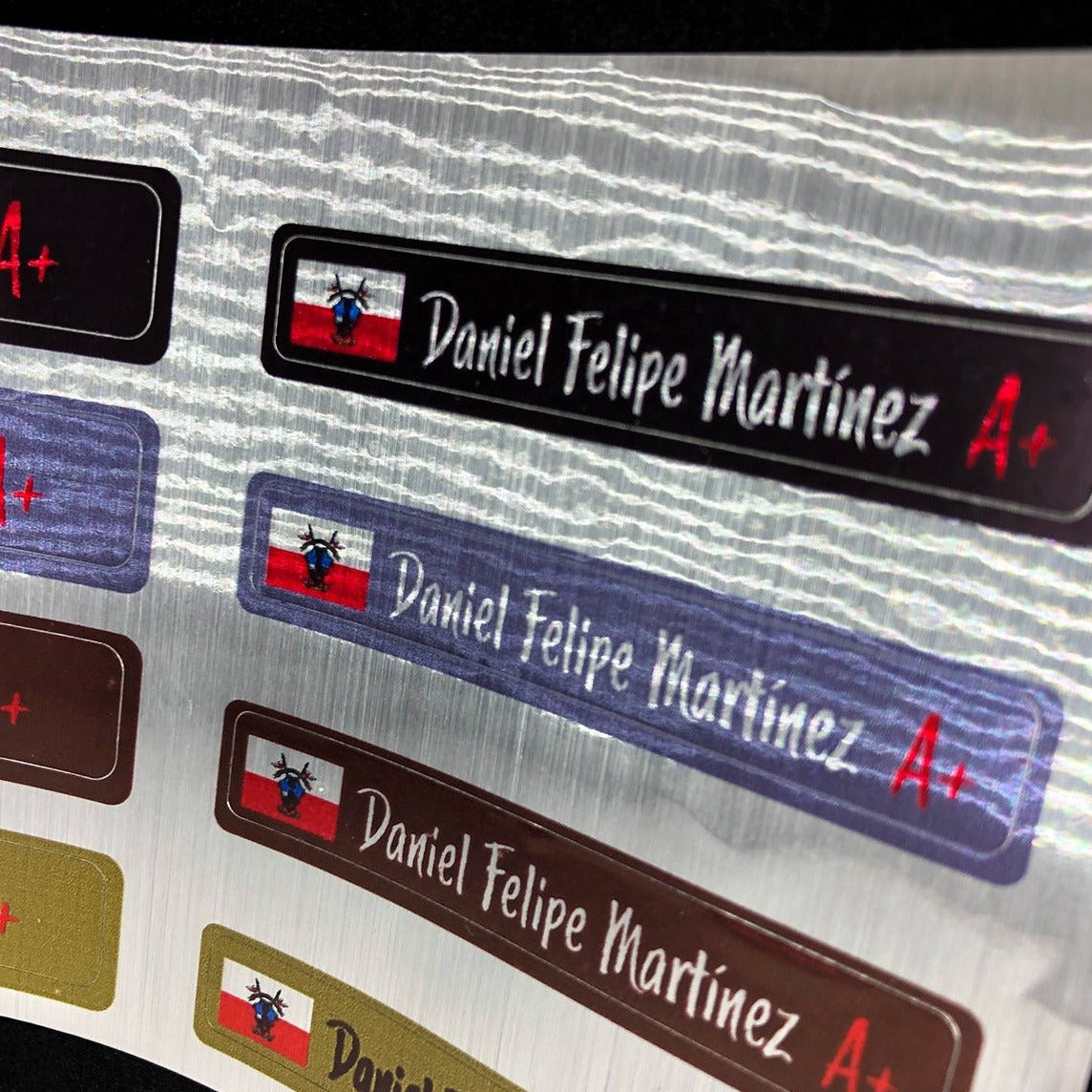 Set de 4 Stickers grandes + 4 Stickers pequeños en Vinilo LAMINADO personalizados con tu NOMBRE APELLIDO, RH y BANDERA.