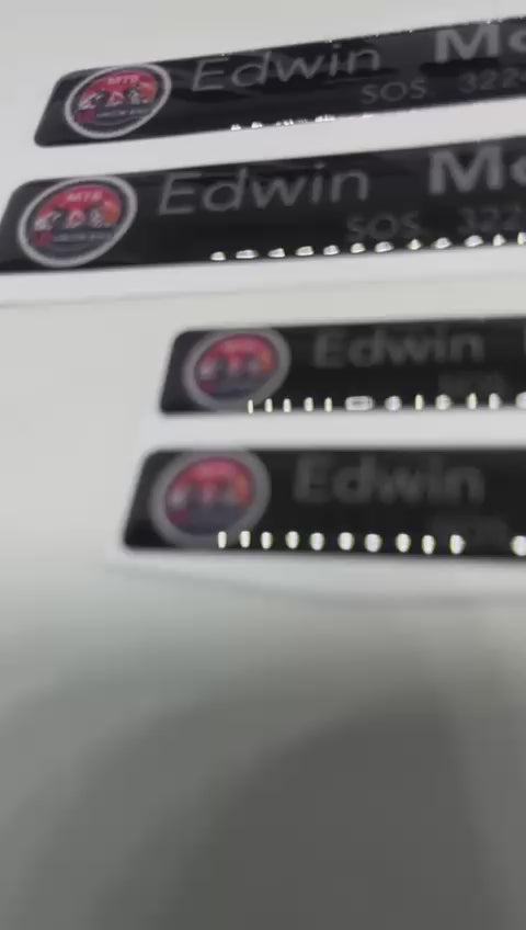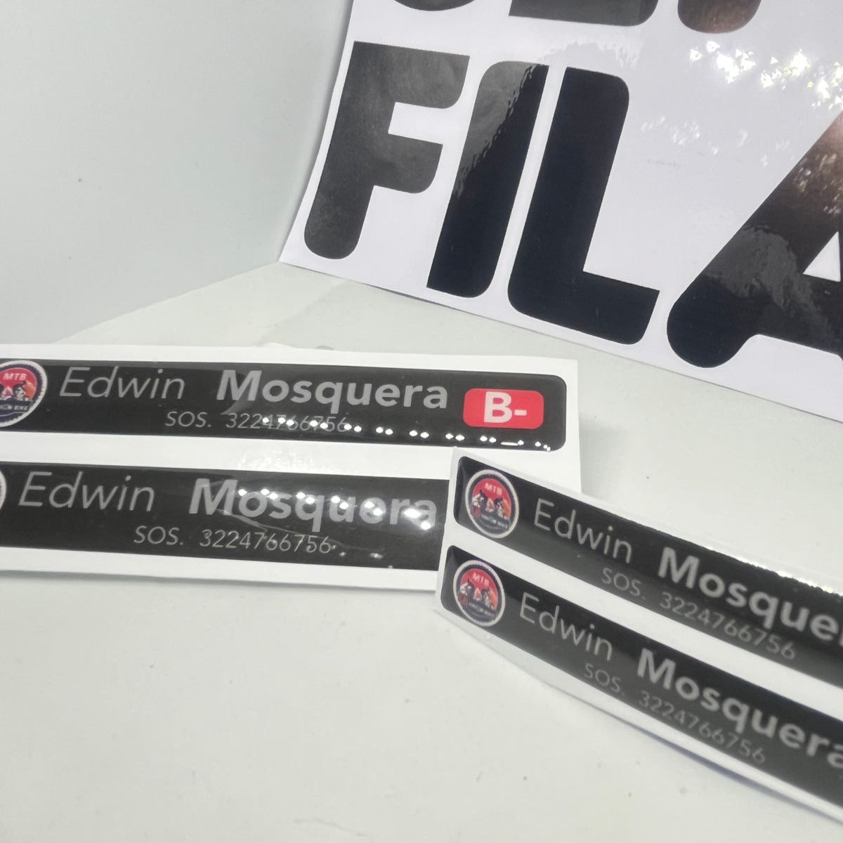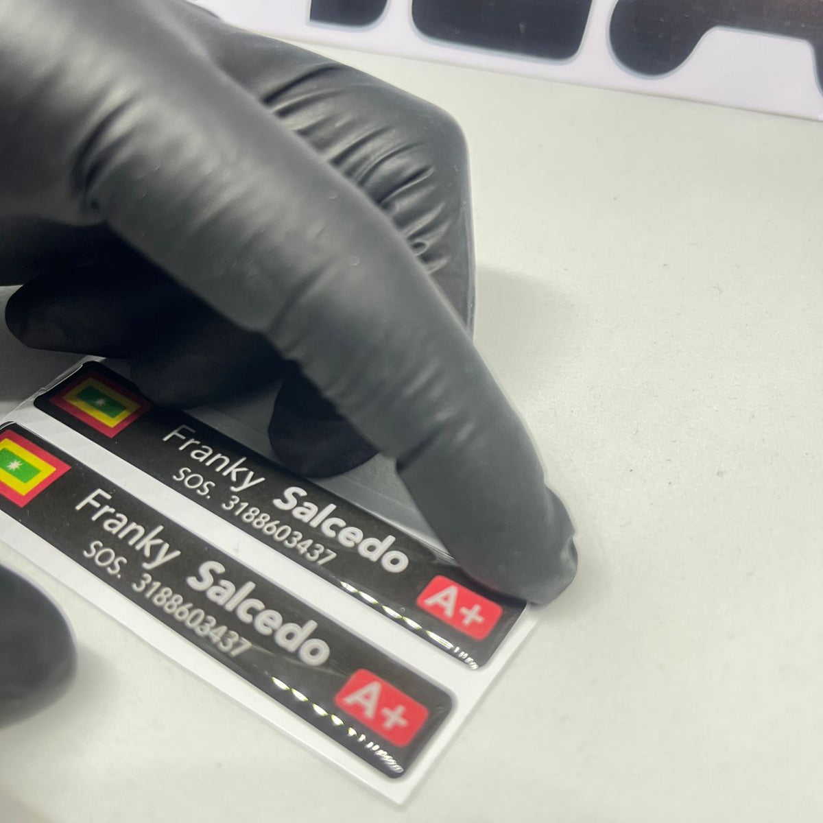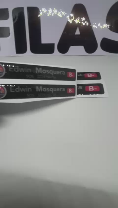 Set de 2 Stickers grandes + 2 Stickers pequeños en Vinilo RESINADO personalizados con tu NOMBRE APELLIDO, RH, NUMERO SOS y BANDERA.